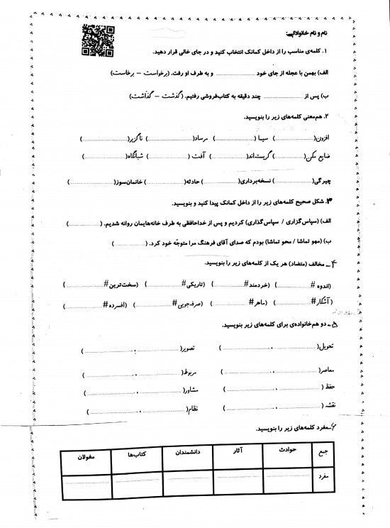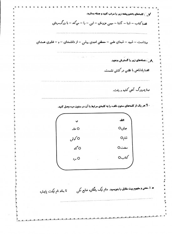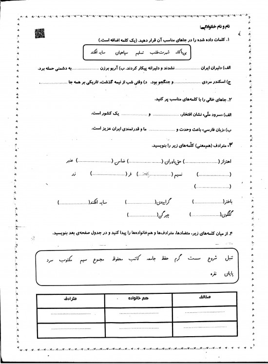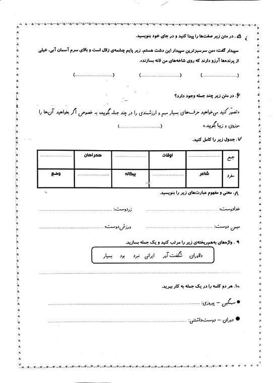 4. شادی – نادان – روشنایی – آسانترین - نهان –تنبل – اسراف – خوشحال