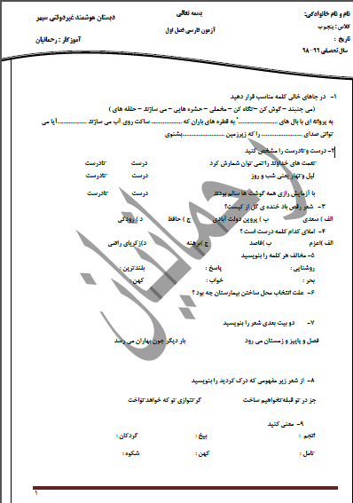 آزمون فارسی درس 1 تا 3آزمون فارسی درس 1 تا 3 نظرات خوانندگانتا کنون هیچ نظری درباره این مطلب ثبت نشده استنظر جدیدنام* ایمیلنظر* متن تصویر*