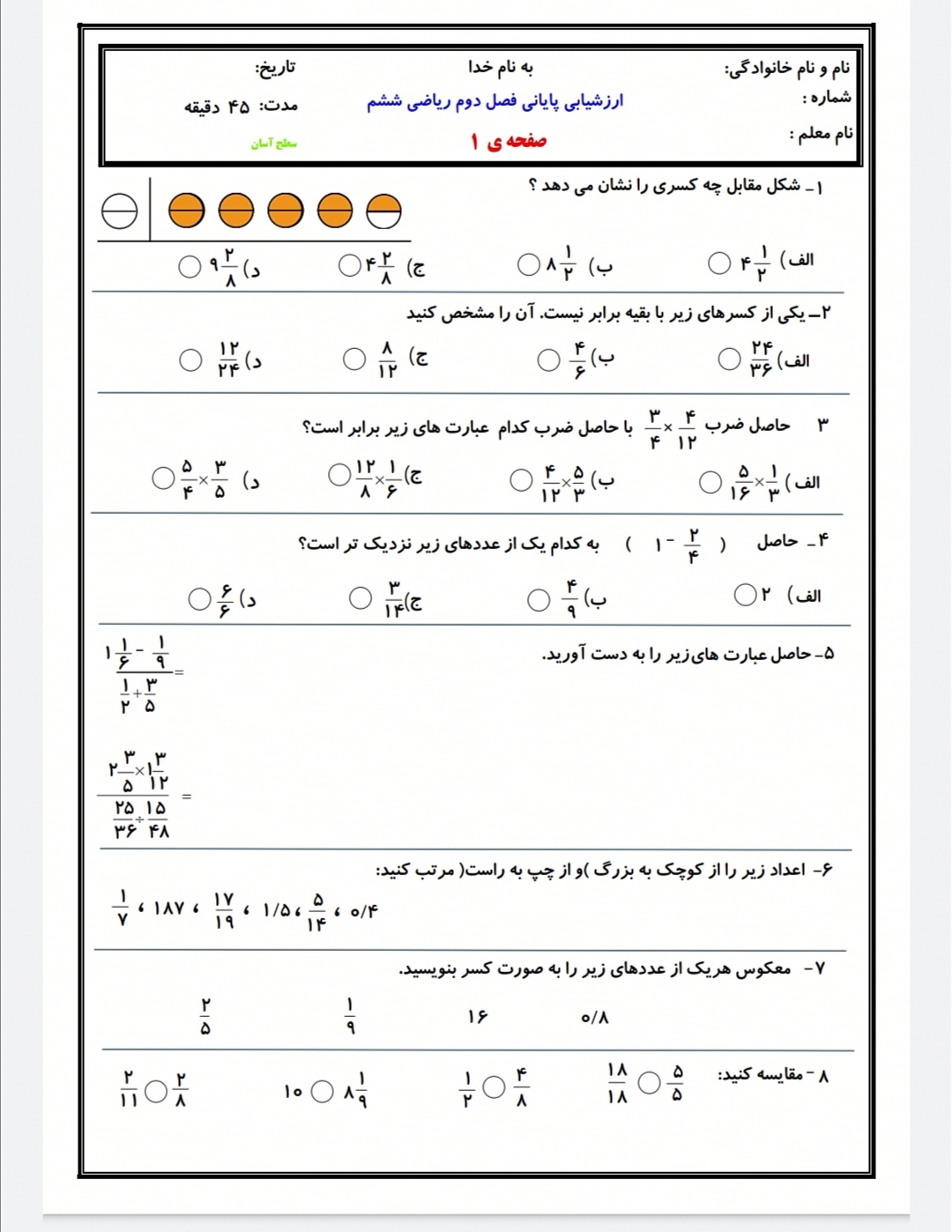 قسمت اول از سوالات کسر پایان هفته
