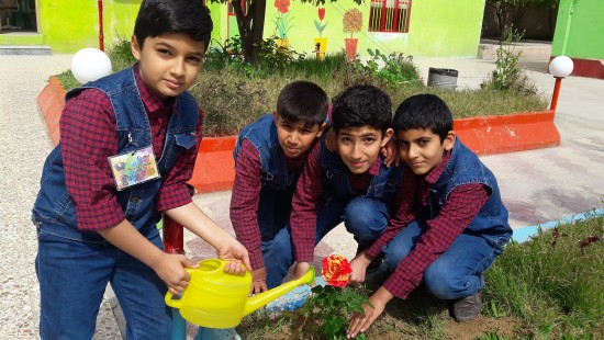 کاشتن درخت در حیاط مدرسه در روز درخت کاری